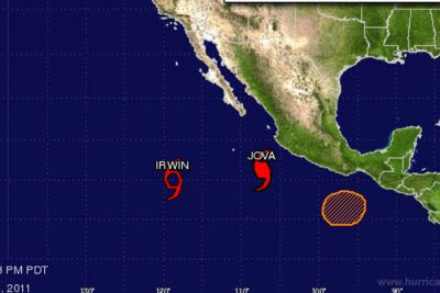 huracán Jova pasó este domingo a categoría tres en el océano Pacífico a 420 km de la costas mexicanas. Autoridades emitieron alerta desde San Telmo hasta Cabo Corrientes que abarca toda la toda la zona central de la nación. En el boletín de las 09H00 GMT del Centro Nacional de Huracanes de Estados Unidos (NHC por su sigla en inglés), se reportaba a Jova como un huracán de vientos de 195 km/h y con un pronóstico de aumento para este lunes. El fenómeno, que se mueve hacia el este a 11 kph, se espera que toque tierra ya fortalecido el martes. Se ha declarado alerta de huracán desde San Telmo por el norte hasta Cabo Corrientes. Una advertencia de tormenta tropical fue declarada asimismo hacia el sur de esa localidad. Mientras, la tormenta tropical Irwin continuaba desplazándose por el este del Océano Pacífico a unos mil 260 kilómetros al suroeste del extremo sur de Baja California. Irwin llevaba vientos máximos de 85 kph . En la temporada, que comenzó el 1 de junio, tres huracanes de han formado en el Pacífico: Adrian, Dora y Eugene. En el Atlántico se han formado 16 tormentas tropicales y cuatro huracanes, incluyendo a Ophelia. Dos de los ciclones fueron de gran intensidad. El huracán Irene, el más potente de todos los registrados, dejó graves daños materiales y más de 20 fallecidos en la región este de Estados Unidos. La Administración Nacional de Océanos y Atmósfera (NOAA, por su sigla en inglés) vaticinó que durante la temporada se formarán entre 14 y 19 tormentas, de las que de siete a 10 se transformarán en huracanes. De ellos, entre tres y cinco podrían ser huracanes de gran intensidad, con vientos superiores a los 178 kilómetros por hora. http://www.telesurtv.net
